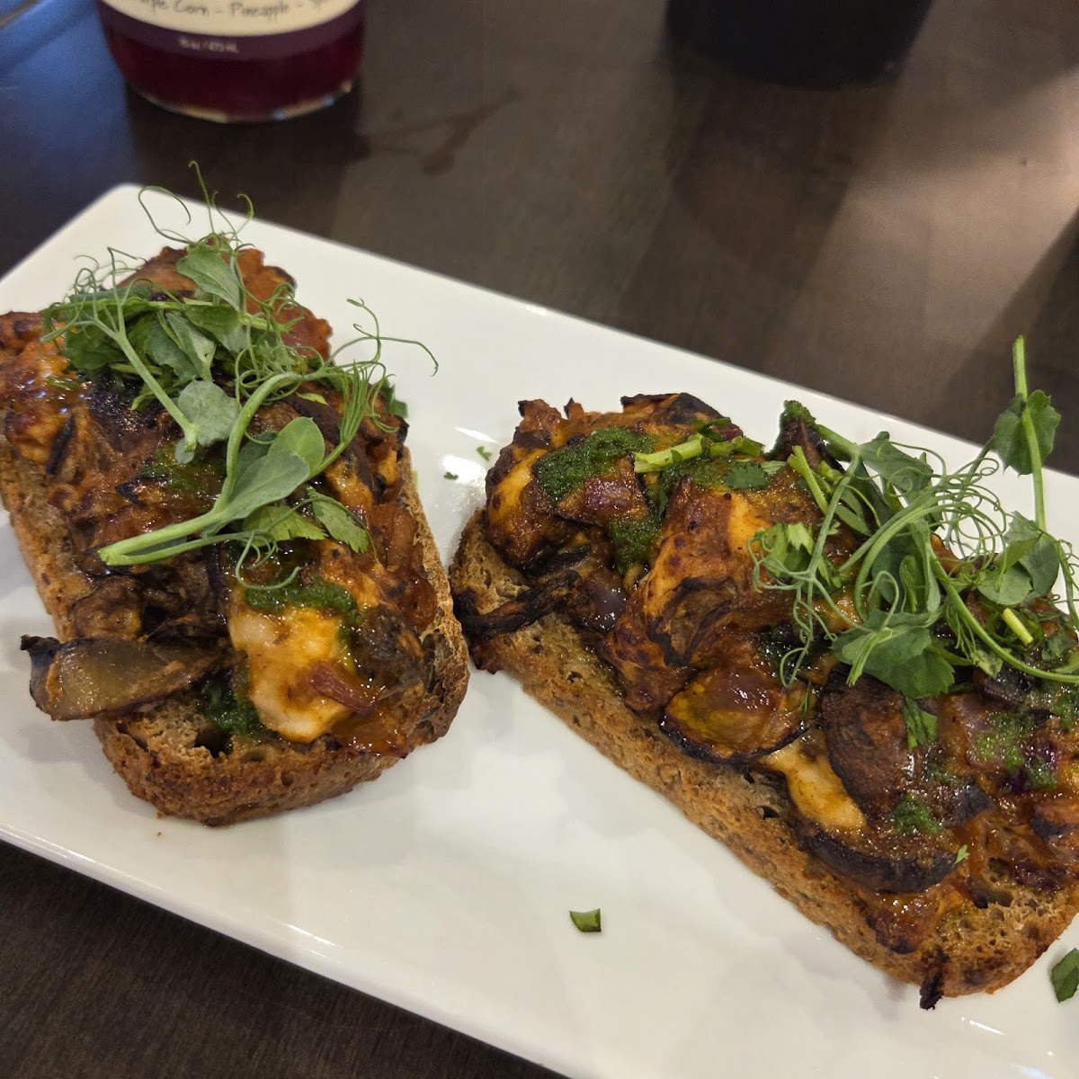 Open-faced sourdough toast topped with a savory blend of sautéed mushrooms, cheese and caramelized onions; finished with micro greens, house made herb oil, and chili flakes (optional).